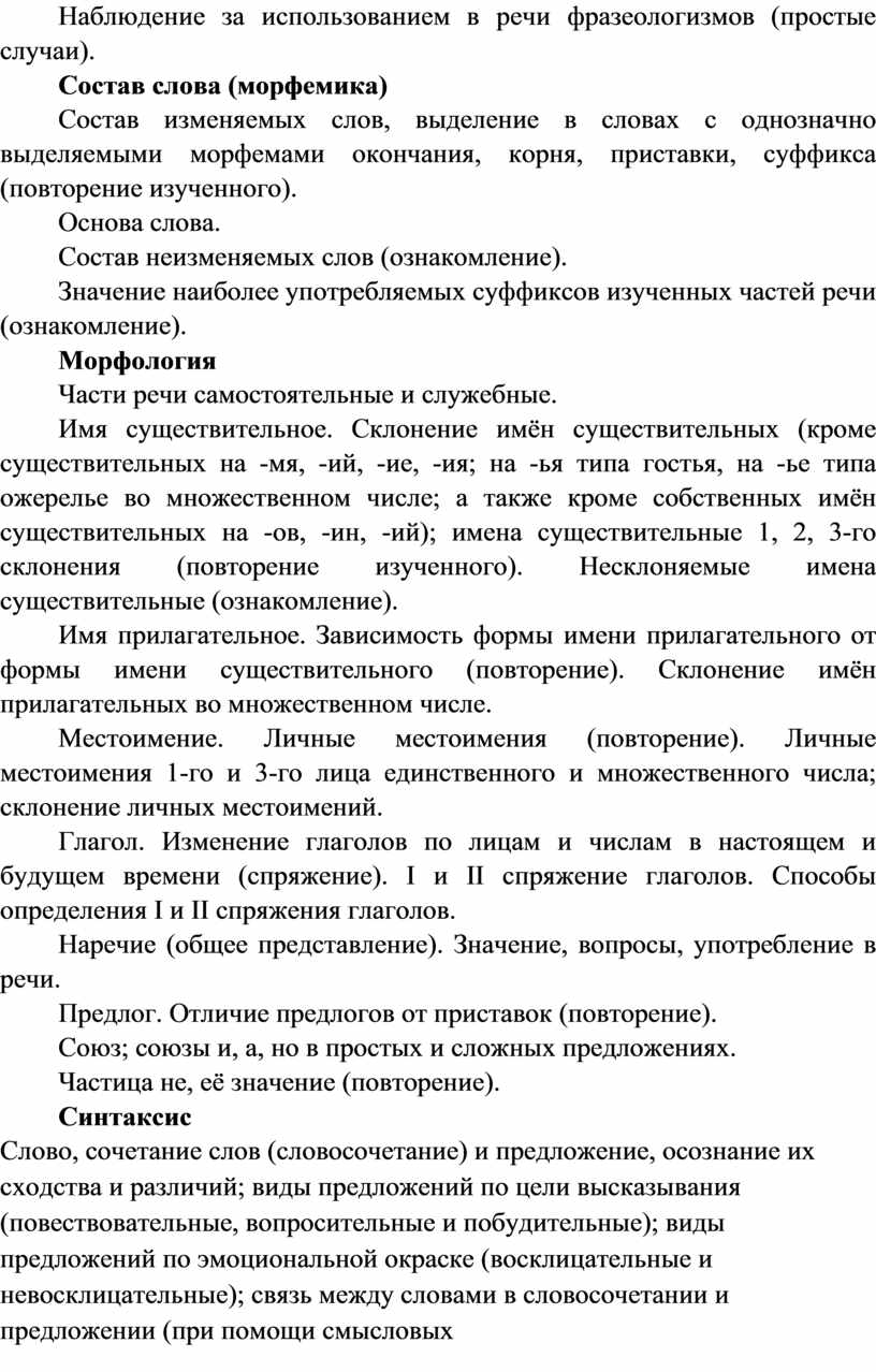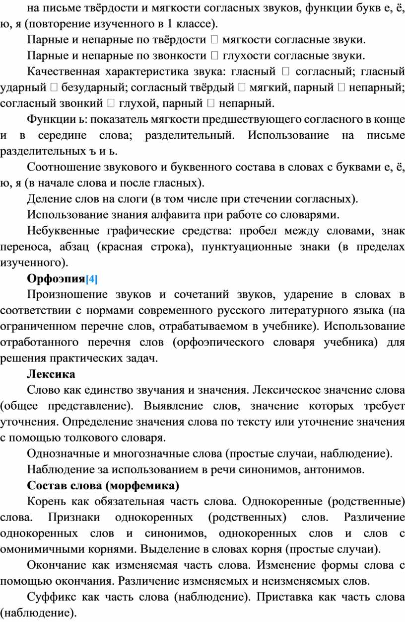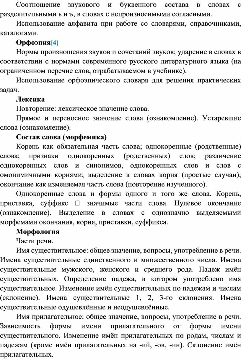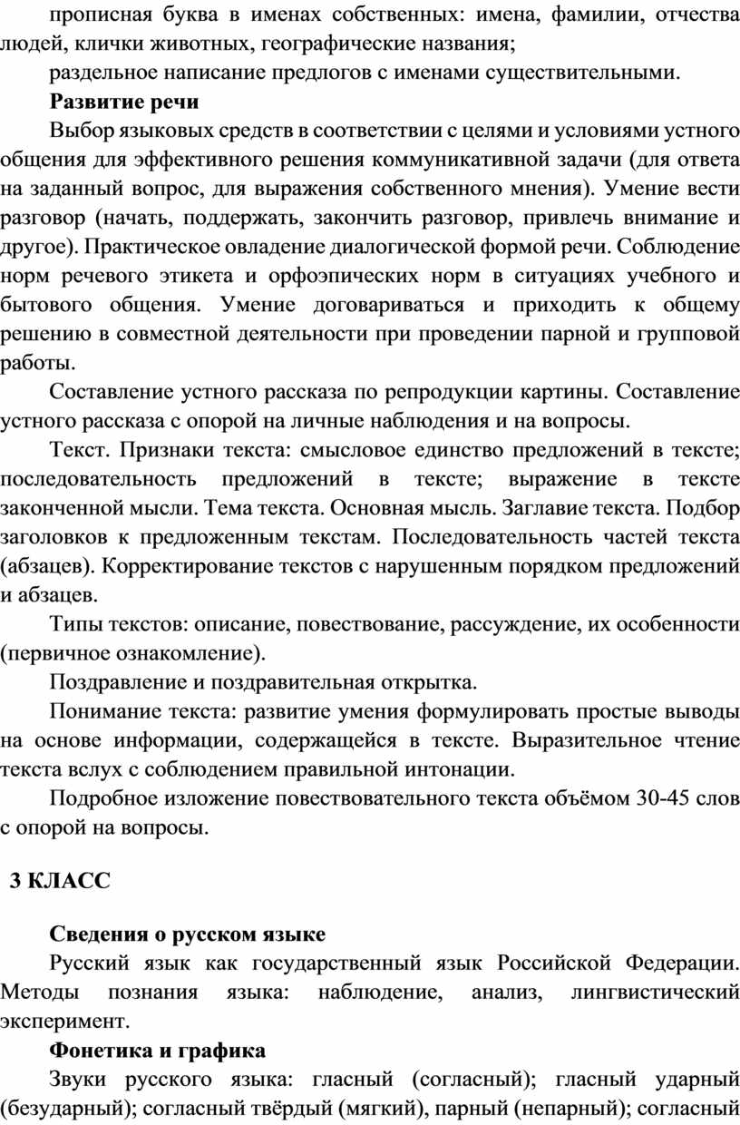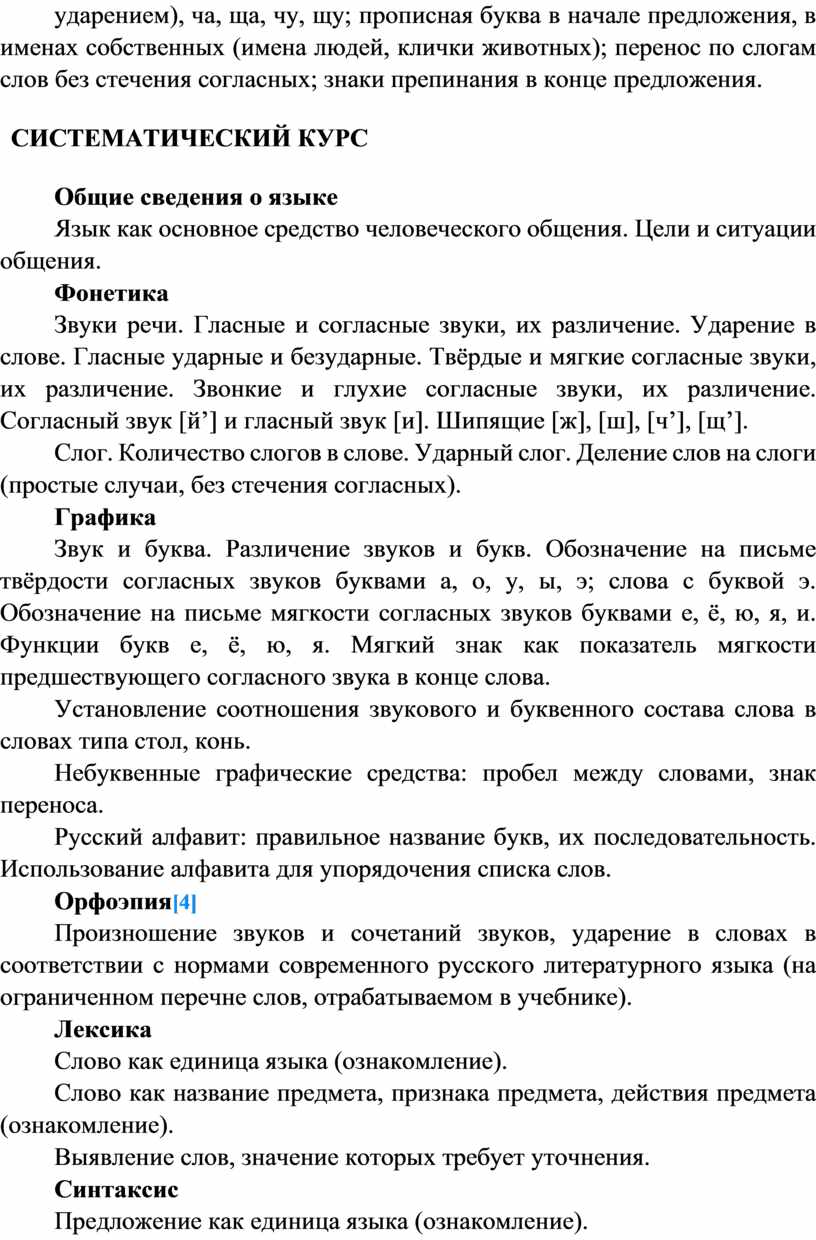 3) овладение первоначальными научными представлениями о системе русского языка: фонетика, графика, лексика, морфемика, морфология и синтаксис; об основных единицах языка, их признаках и особенностях употребления в речи; использование в речевой деятельности норм современного русского литературного языка (орфоэпических, лексических, грамматических, орфографических, пунктуационных) и речевого этикета;