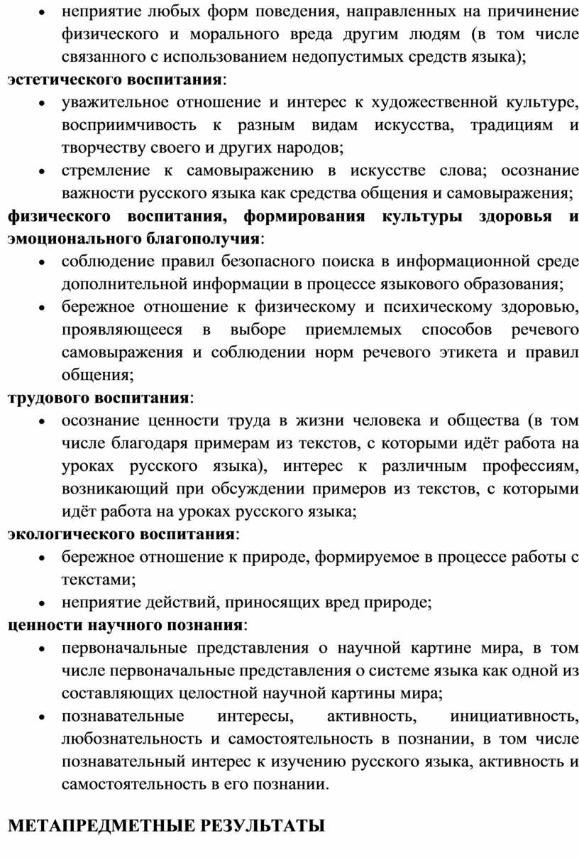 Изучение русского языка обладает огромным потенциалом присвоения традиционных социокультурных и духовно-нравственных ценностей, принятых в обществе правил и норм поведения, в том числе речевого, что способствует формированию внутренней позиции личности. Личностные достижения обучающегося непосредственно связаны с осознанием языка как явления национальной культуры, пониманием связи языка и мировоззрения народа. Значимыми личностными результатами являются развитие устойчивого познавательного интереса к изучению русского языка, формирование ответственности за сохранение чистоты русского языка.