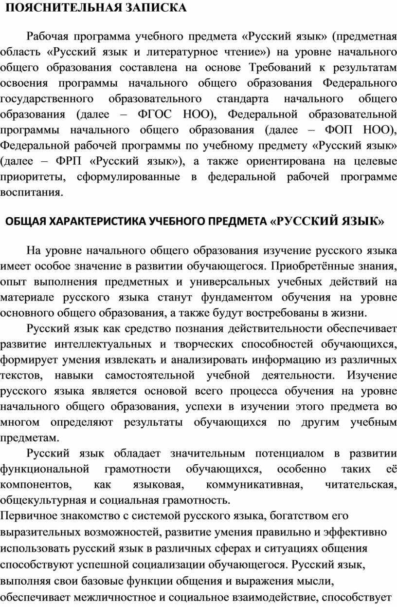 Рабочая программа учебного предмета «Русский язык» (предметная область «Русский язык и литературное чтение») на уровне начального общего образования составлена на основе Требований к результатам освоения программы начального общего образования Федерального государственного образовательного стандарта начального общего образования (далее – ФГОС НОО), Федеральной образовательной программы начального общего образования (далее – ФОП НОО), Федеральной рабочей программы по учебному предмету «Русский язык» (далее – ФРП «Русский язык»), а также ориентирована на целевые приоритеты, сформулированные в федеральной рабочей программе воспитания.