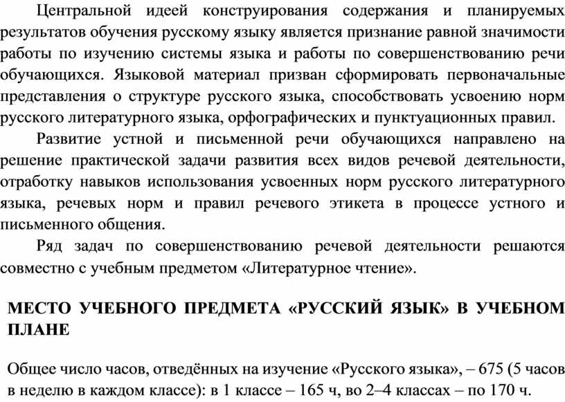 Центральной идеей конструирования содержания и планируемых результатов обучения русскому языку является признание равной значимости работы по изучению системы языка и работы по совершенствованию речи обучающихся. Языковой материал призван сформировать первоначальные представления о структуре русского языка, способствовать усвоению норм русского литературного языка, орфографических и пунктуационных правил.