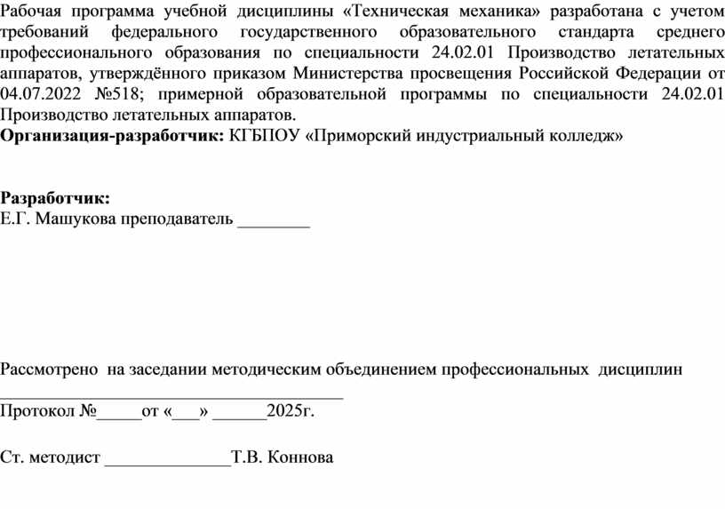 Рабочая программа учебной дисциплины «Техническая механика» разработана с учетом требований федерального государственного образовательного стандарта среднего профессионального образования по специальности 24.02.01 Производство летательных аппаратов, утверждённого приказом Министерства просвещения Российской Федерации от 04.07.2022 №518; примерной образовательной программы по специальности 24.02.01 Производство летательных аппаратов.