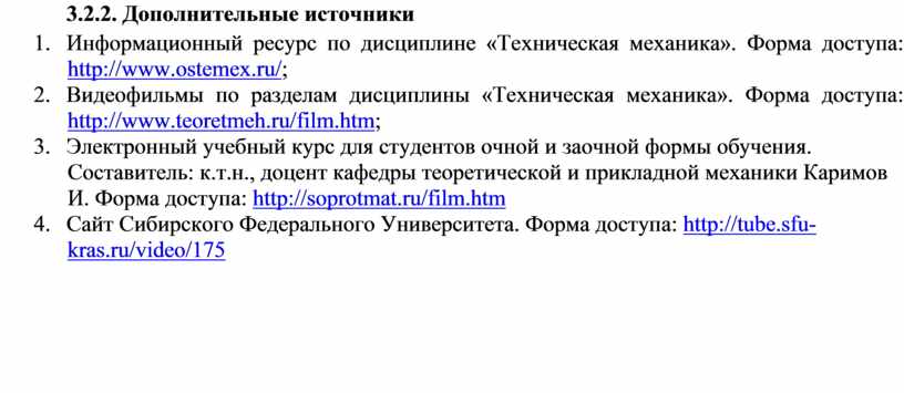 1. Информационный ресурс по дисциплине «Техническая механика». Форма доступа: http://www.ostemex.ru/;