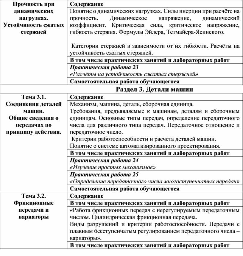 - основные понятия и аксиомы теоретической механики, законы равновесия и перемещения тел; - виды машин и механизмов, их кинематические и динамические характеристики; - типы кинематических пар; - типы соединений деталей и машин; - виды движений и преобразующие движения механизмы; - методики выполнения основных расчетов по теоретической механике, сопротивлению материалов и деталям машин; - методику расчета элементов конструкций на прочность, жесткость и устойчивость при растяжении, сжатии, кручении и изгибе; - методику определения статических и динамических нагрузок на элементы конструкций, кинематические и динамические характеристики машин и механизмов; -виды передач; - основные сборочные единицы и детали.