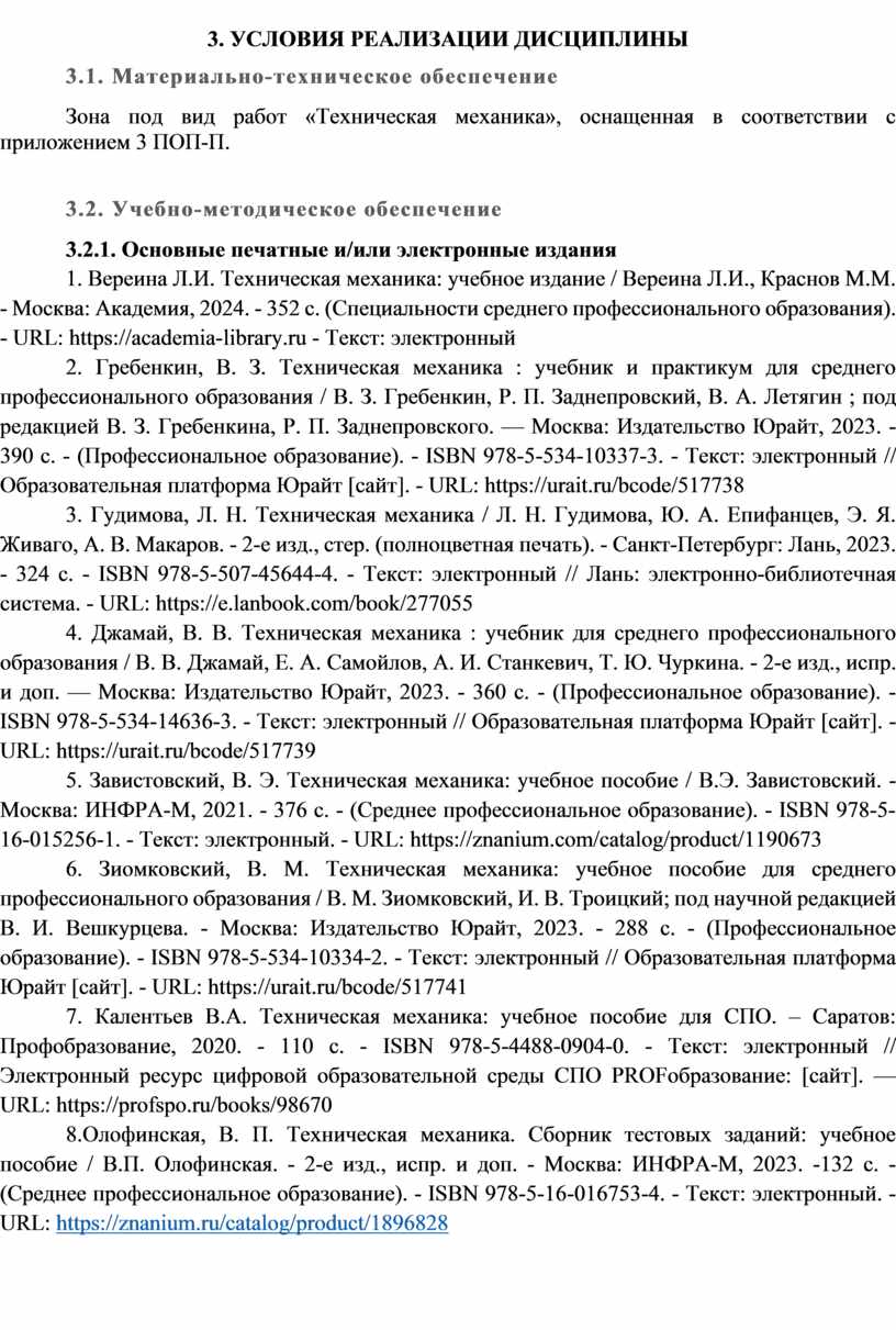 1. Вереина Л.И. Техническая механика: учебное издание / Вереина Л.И., Краснов М.М. - Москва: Академия, 2024. - 352 c. (Специальности среднего профессионального образования). - URL: https://academia-library.ru - Текст: электронный