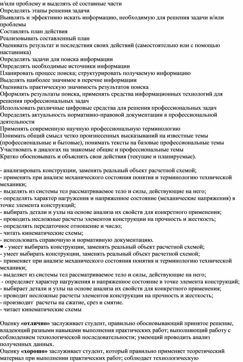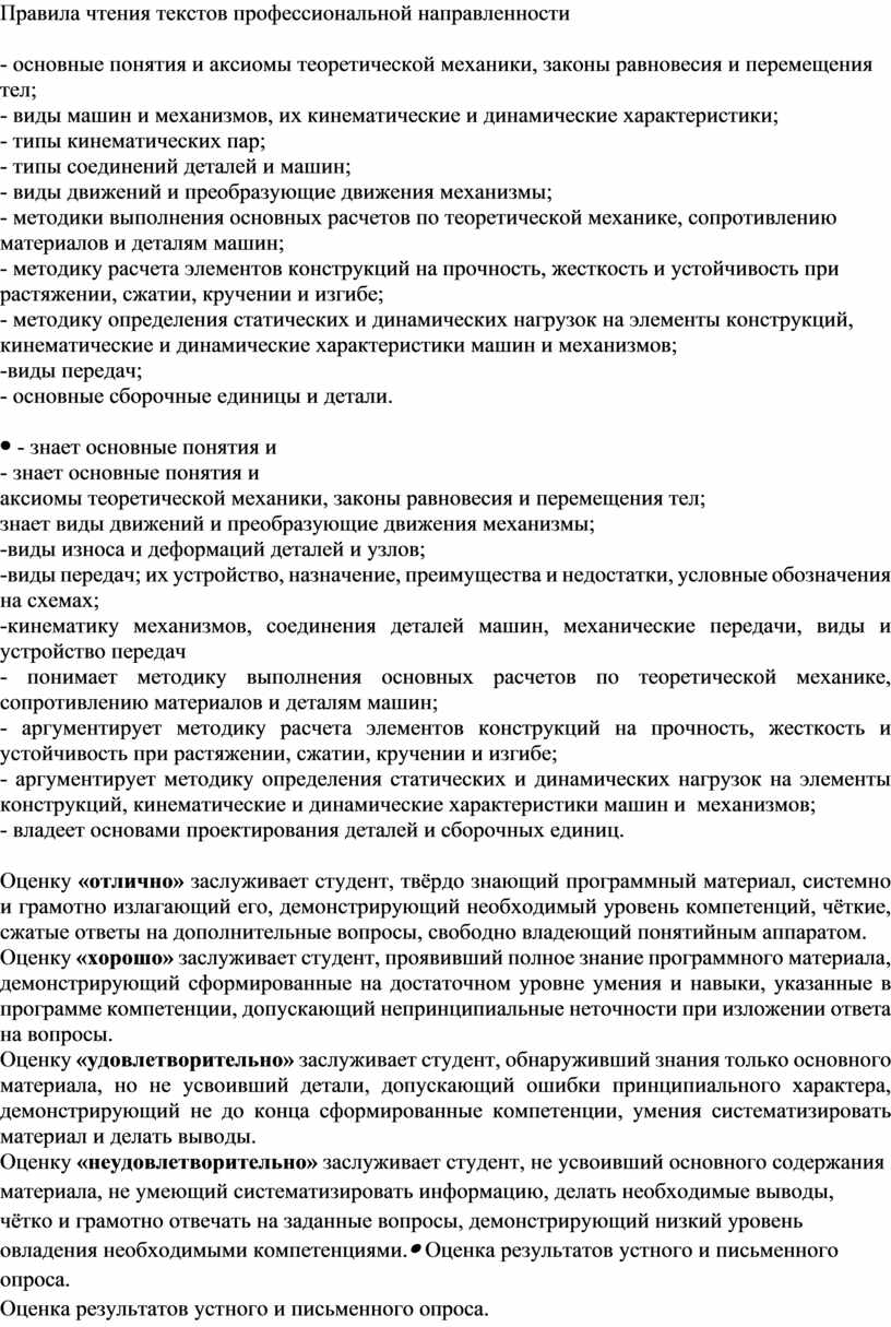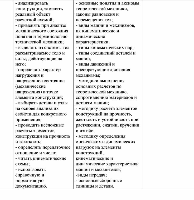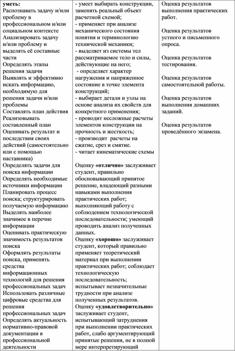 - знает основные понятия и аксиомы теоретической механики, законы равновесия и перемещения тел; знает виды движений и преобразующие движения механизмы; -виды износа и деформаций деталей и узлов; -виды передач; их устройство, назначение, преимущества и недостатки, условные обозначения на схемах; -кинематику механизмов, соединения деталей машин, механические передачи, виды и устройство передач - понимает методику выполнения основных расчетов по теоретической механике, сопротивлению материалов и деталям машин; - аргументирует методику расчета элементов конструкций на прочность, жесткость и устойчивость при растяжении, сжатии, кручении и изгибе; - аргументирует методику определения статических и динамических нагрузок на элементы конструкций, кинематические и динамические характеристики машин и механизмов; - владеет основами проектирования деталей и сборочных единиц.