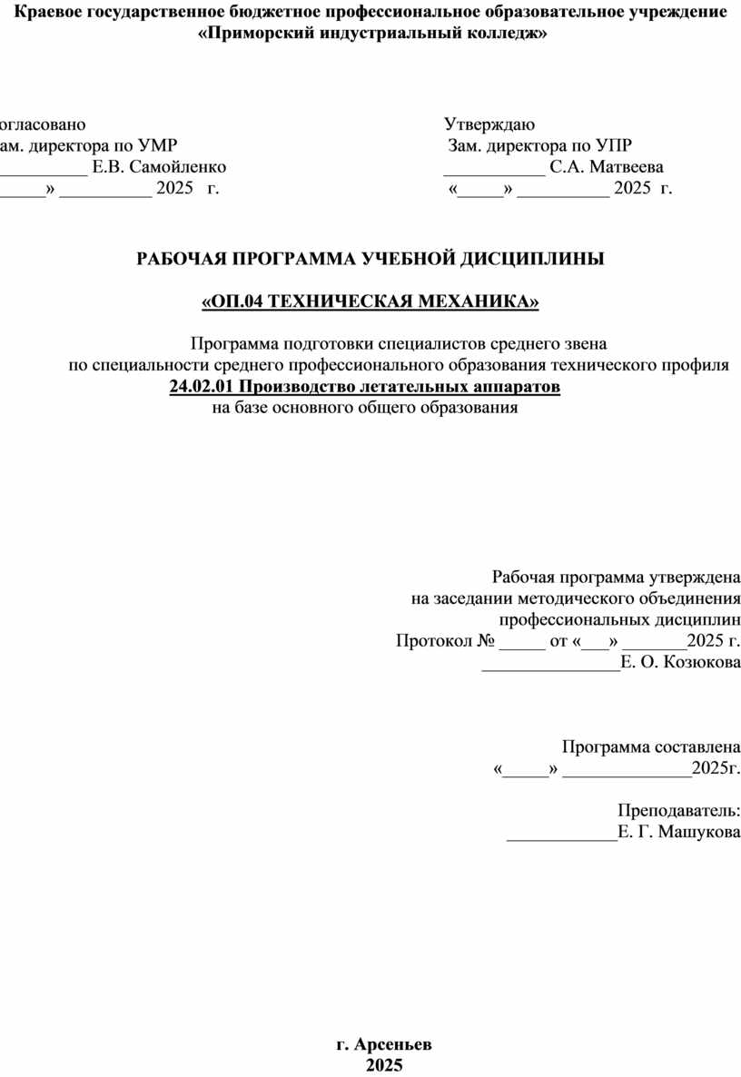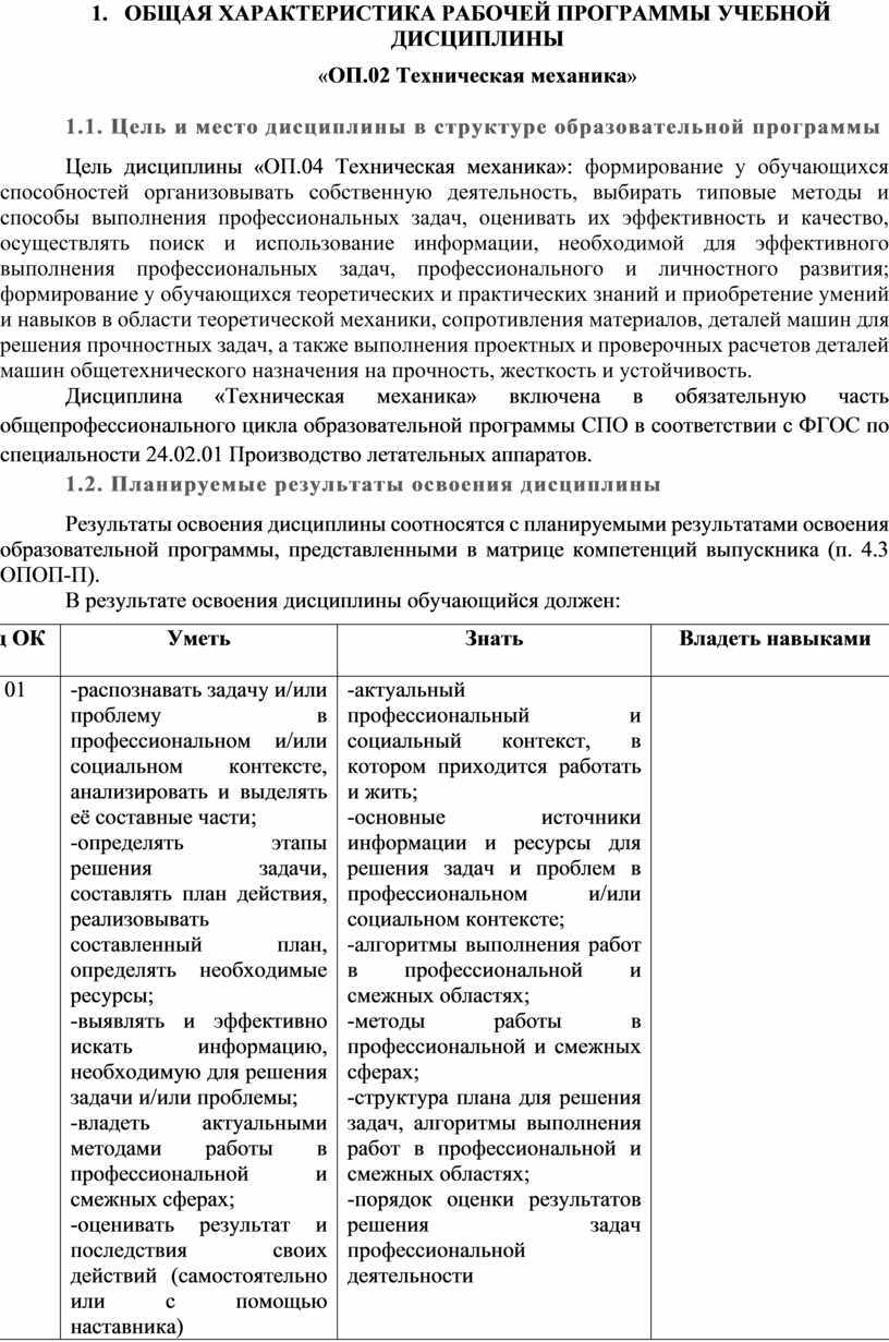 Дисциплина «Техническая механика» включена в обязательную часть общепрофессионального цикла образовательной программы СПО в соответствии с ФГОС по специальности 24.02.01 Производство летательных аппаратов.