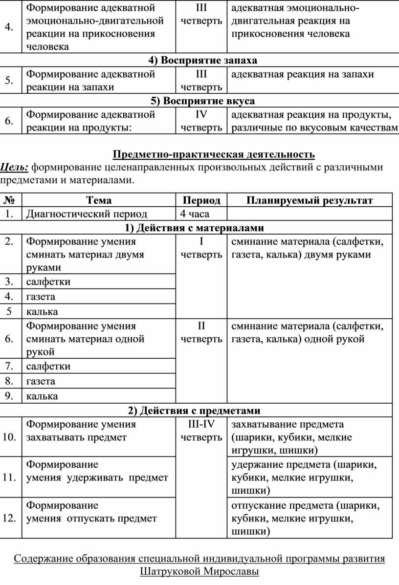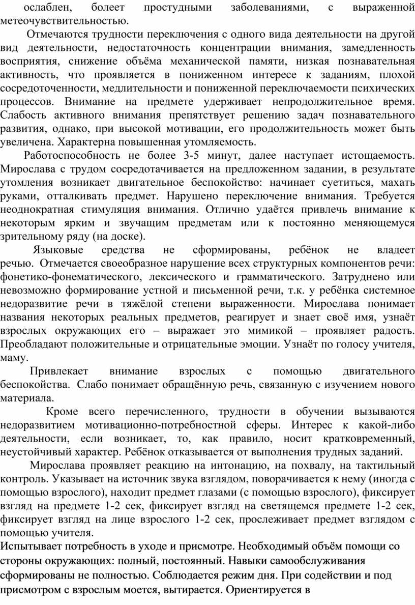 § Потребность в максимально раннем выявлении и комплексной коррекции имеющихся отклонений в развитии осуществлена не была. Мирослава была принята в 1-ый подготовительный класс школы в 7 лет. Дошкольная подготовка проводилась в сопровождении тьютора.