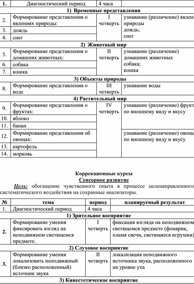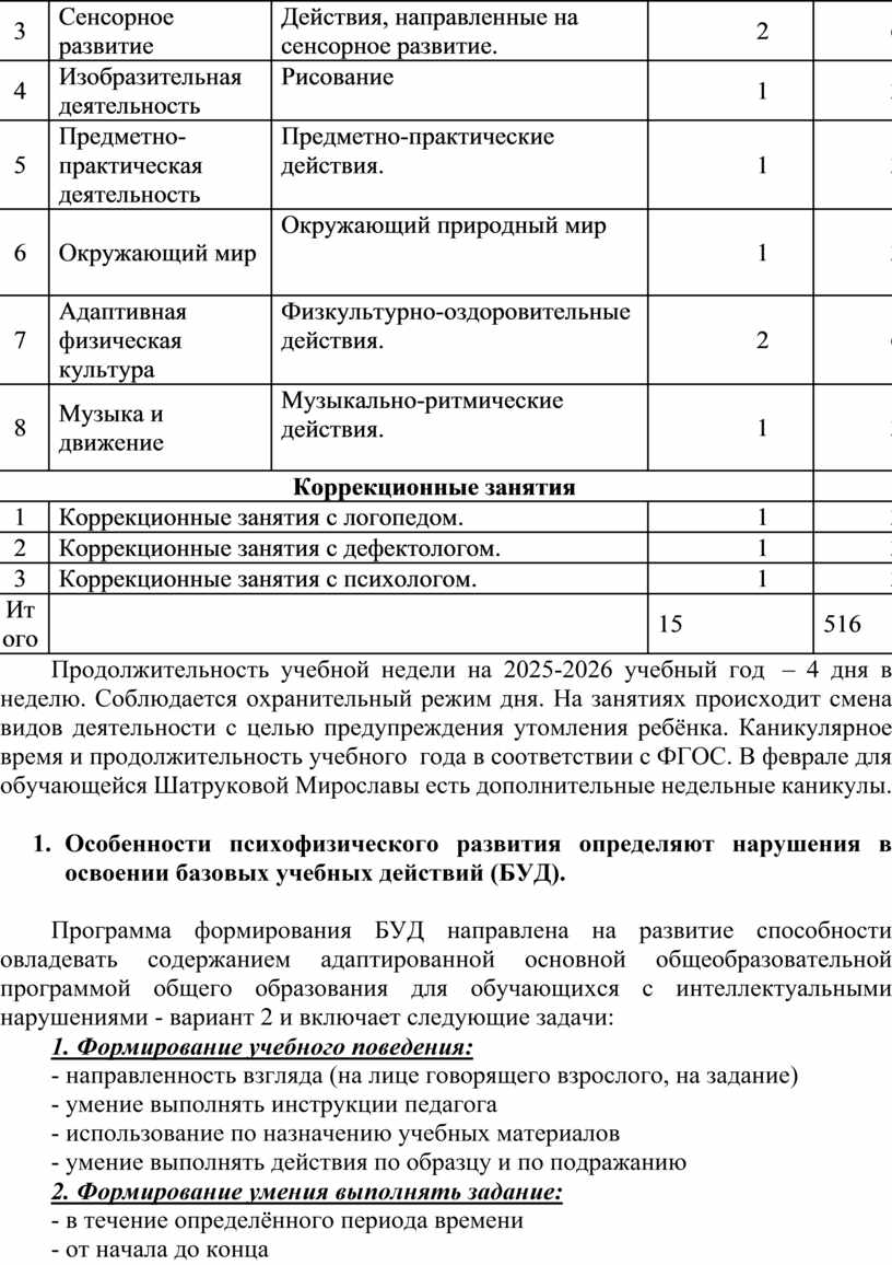 Приоритетными учебными предметами являются: «Речь и альтернативная коммуникация», «Математические представления», «Окружающий природный мир» Приоритетами в коррекционно-развивающей области являются развитие предметно – практических действий («Действия с материалами», «Действия с предметами»), сенсорное развитие.