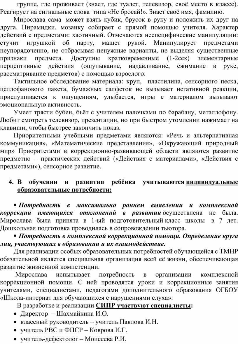 Мирослава испытывает потребность в организации комплексной коррекционной помощи. С ней проводятся уроки и коррекционные занятия учителями, специалистами, педагогами дополнительного образования ОГБОУ «Школа-интернат для обучающихся с нарушениями слуха».