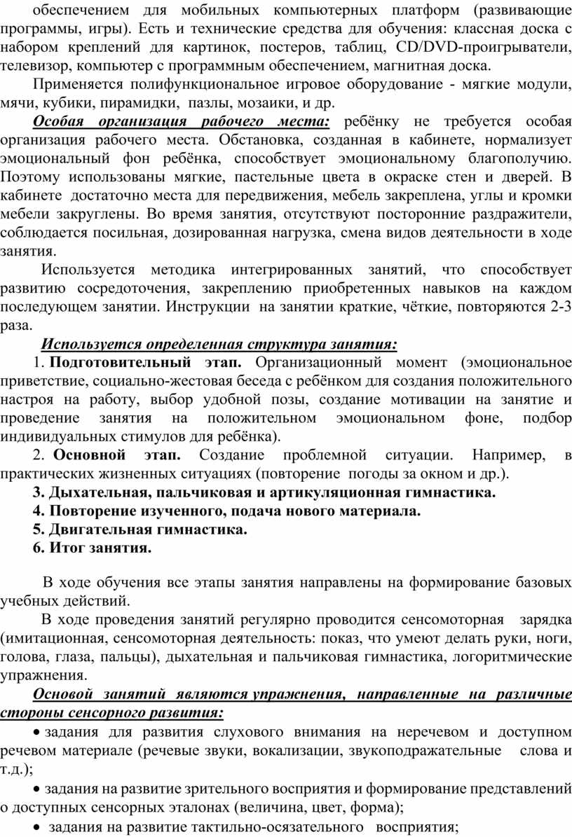 Особая организация рабочего места: ребёнку не требуется особая организация рабочего места. Обстановка, созданная в кабинете, нормализует эмоциональный фон ребёнка, способствует эмоциональному благополучию. Поэтому использованы мягкие, пастельные цвета в окраске стен и дверей. В кабинете достаточно места для передвижения, мебель закреплена, углы и кромки мебели закруглены. Во время занятия, отсутствуют посторонние раздражители, соблюдается посильная, дозированная нагрузка, смена видов деятельности в ходе занятия.