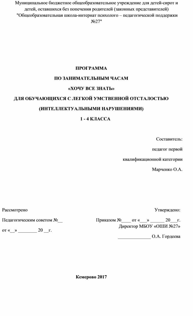 Утверждено: Приказом №____ от «___» ______ 20___г. Директор МБОУ «ОШИ №27» ______________ О.А. Гордеева |