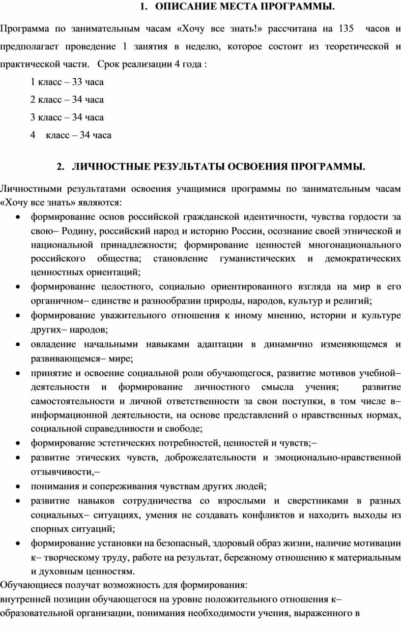 Программа по занимательным часам «Хочу все знать!» рассчитана на 135 часов и предполагает проведение 1 занятия в неделю, которое состоит из теоретической и практической части. Срок реализации 4 года :