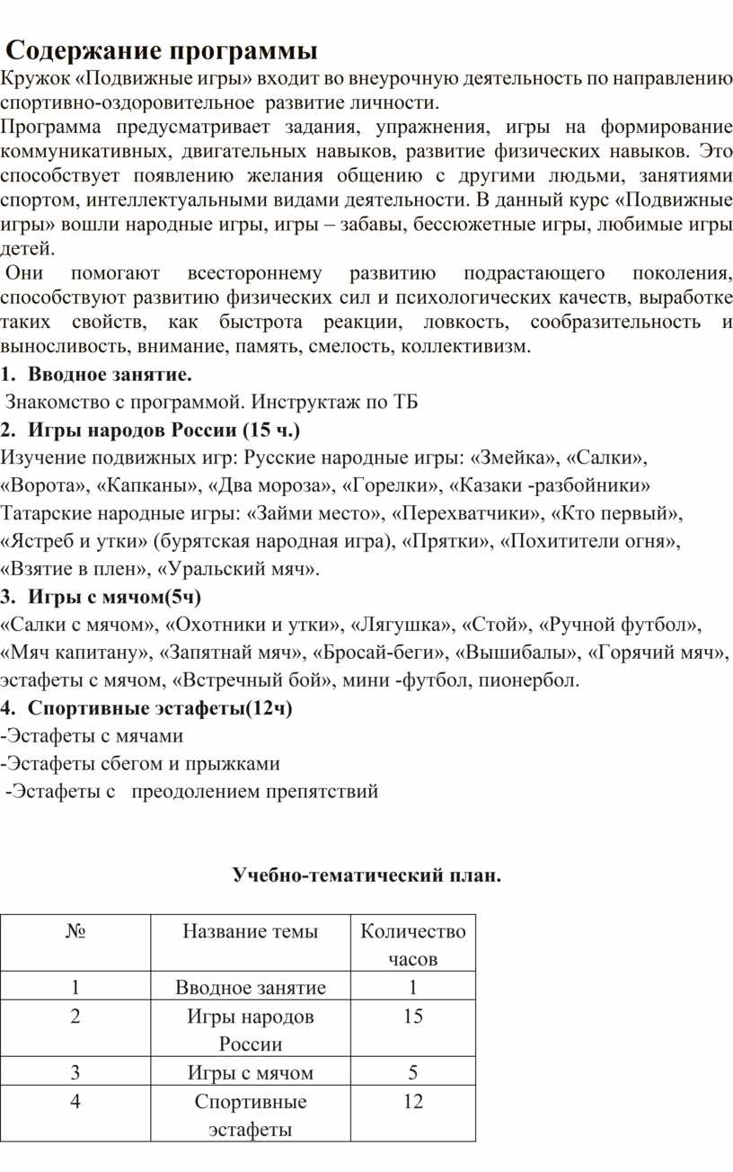 «Подвижные игры» — это еженедельные занятия физическими упражнениями в спортивном зале и на открытом воздухе, которые проводятся во внеурочное время. Это активный отдых, который снимает утомление, вызванное учебной деятельностью, и способствует повышению двигательной активности школьников. Занятия, проводимые на открытом воздухе, имеют оздоровительную ценность.
