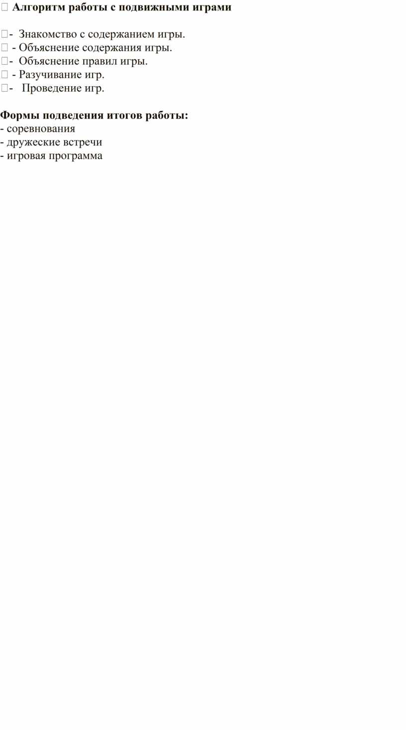 Программа предусматривает задания, упражнения, игры на формирование коммуникативных, двигательных навыков, развитие физических навыков. Это способствует появлению желания общению с другими людьми, занятиями спортом, интеллектуальными видами деятельности. В данный курс «Подвижные игры» вошли народные игры, игры – забавы, бессюжетные игры, любимые игры детей.
