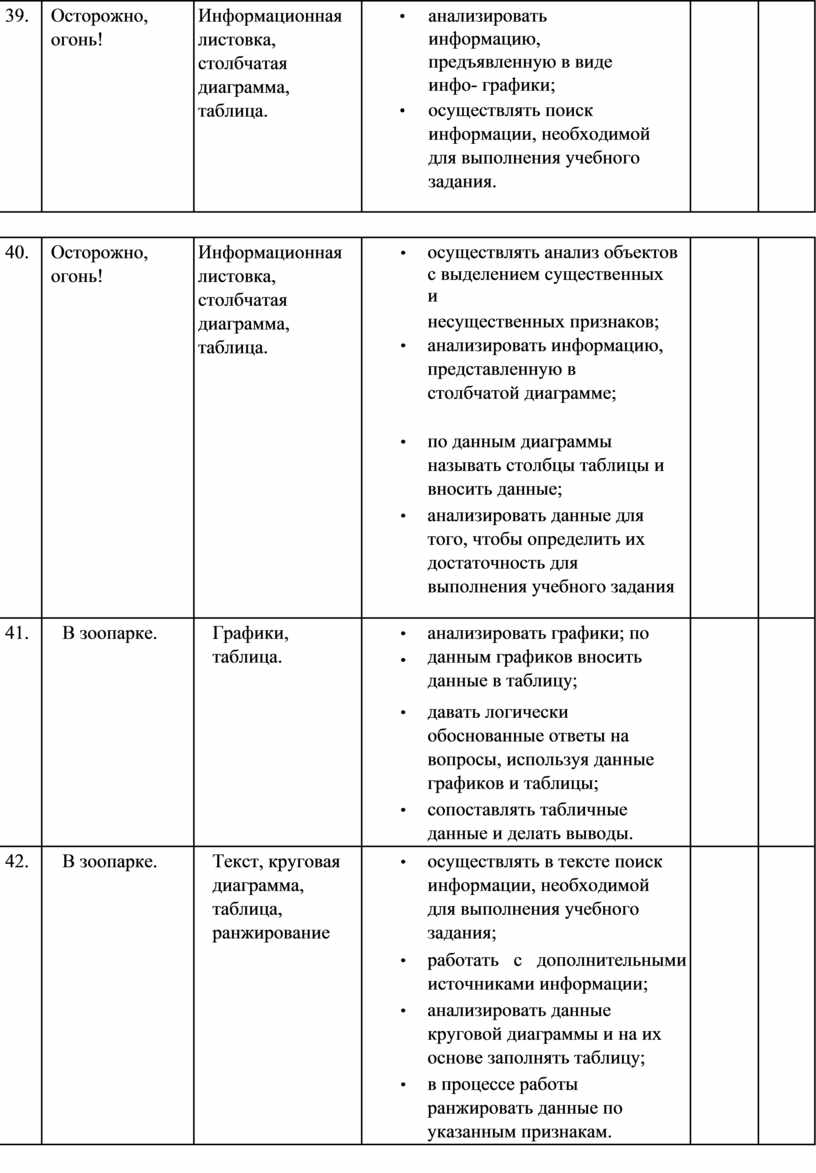 Таблица как информационный объект. Поиск информации, необходимой для решения учебной или практической задачи. Внесение данных в таблицу. Сходства и различия в информации, представленной в явном и неявном видах. Определение достаточности или недостаточности данных для выполнения учебного и практического задания. Ранжирование данных по указанным признакам. Соотнесение информации, представленной в таблице, с жизненной ситуацией. Определение значимой информации для выполнения учебной задачи. Преобразование информации из одной формы в другую. Анализ информации с целью выделения существенных и несущественных признаков. Диаграммы