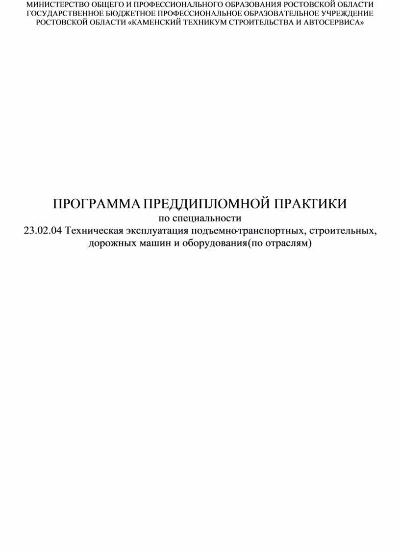 Программа преддипломной практики по специальности 23.02.04 Техническая эксплуатация подъемно-транспортных, строительных, дорожных машин и оборудования (по отраслям) разработана на основе требований: