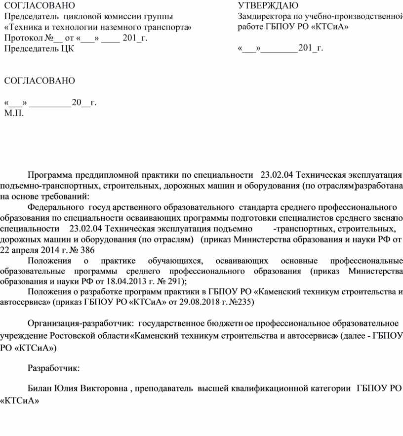 УТВЕРЖДАЮ Замдиректора по учебно-производственной работе ГБПОУ РО «КТСиА» ___________ «___»________201_г.