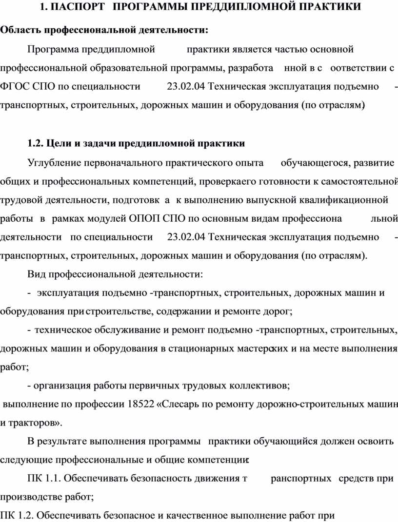 1. ПАСПОРТ ПРОГРАММЫ ПРЕДДИПЛОМНОЙ ПРАКТИКИ