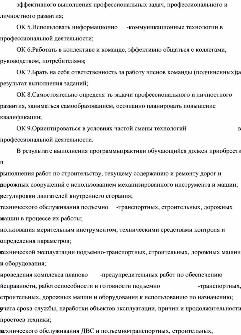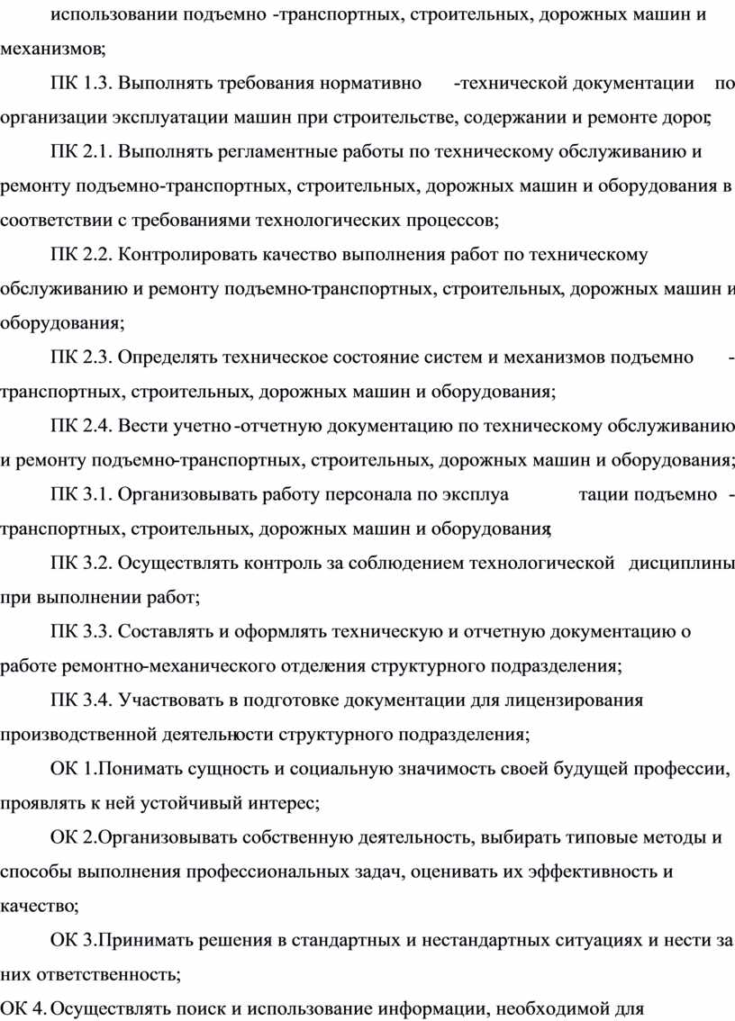 ПК 1.3. Выполнять требования нормативно-технической документации по организации эксплуатации машин при строительстве, содержании и ремонте дорог; |