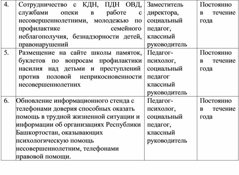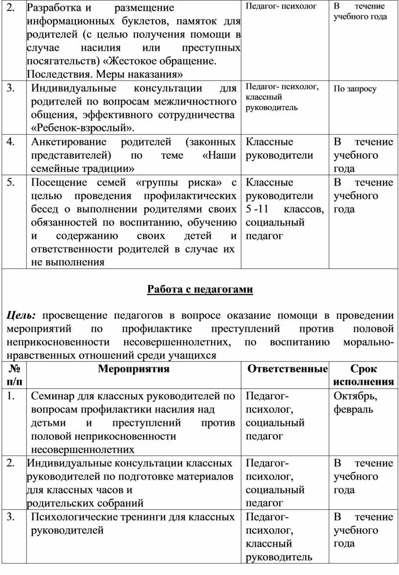 § организация профилактических мероприятий с учащимися и их родителями (законными представителями), педагогическими работниками по недопущению половой неприкосновенности несовершеннолетних и ранних половых связей;