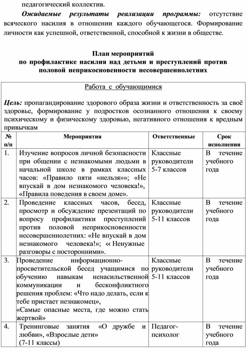 Ожидаемые результаты реализации программы: отсутствие всяческого насилия в отношении каждого обучающегося. Формирование личности как успешной, ответственной, способной к жизни в обществе.