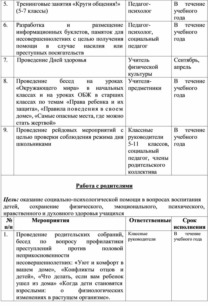 Проведение родительских собраний, бесед по вопросу профилактики преступлений против половой неприкосновенности несовершеннолетних: «Уют и комфорт в вашем доме», «Конфликты отцов и детей», «Что делать, если вам ребенок ушел из дома» «Когда дети становятся взрослыми: о физиологических изменениях в растущем организме». |