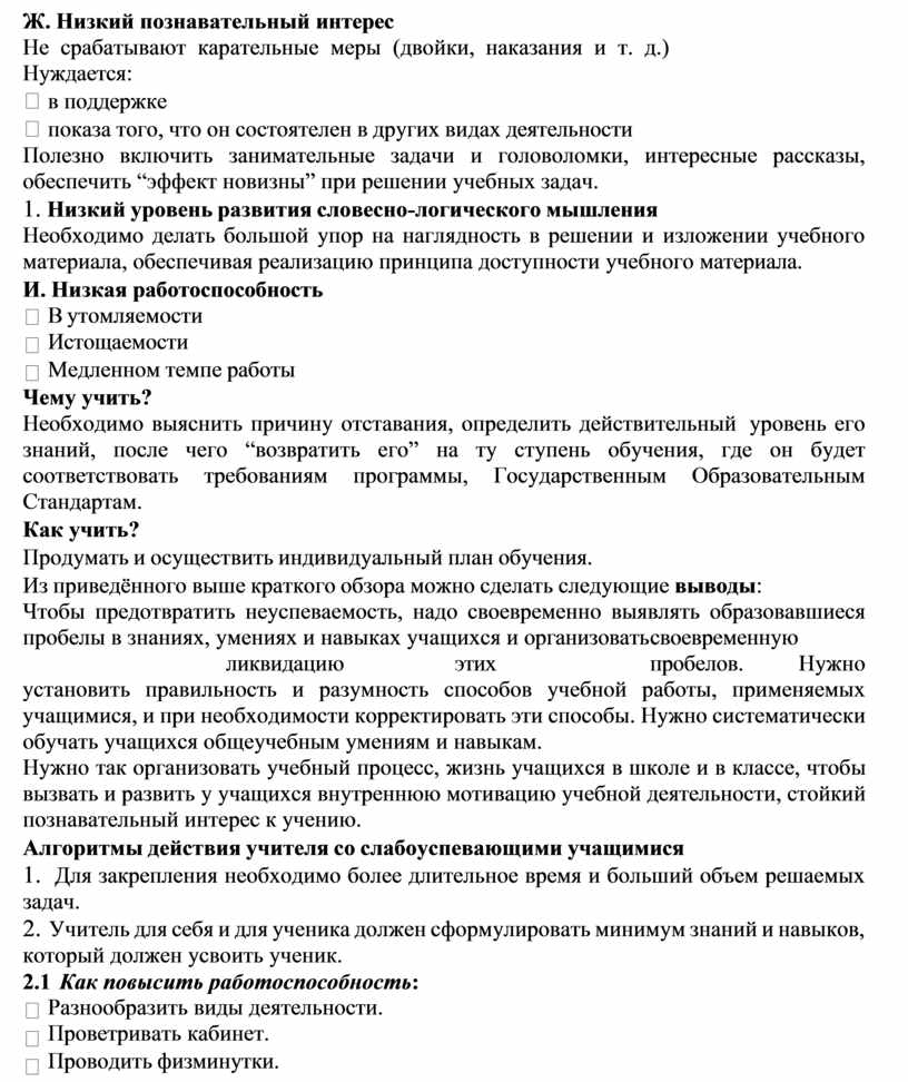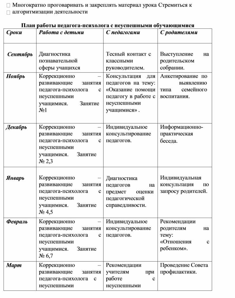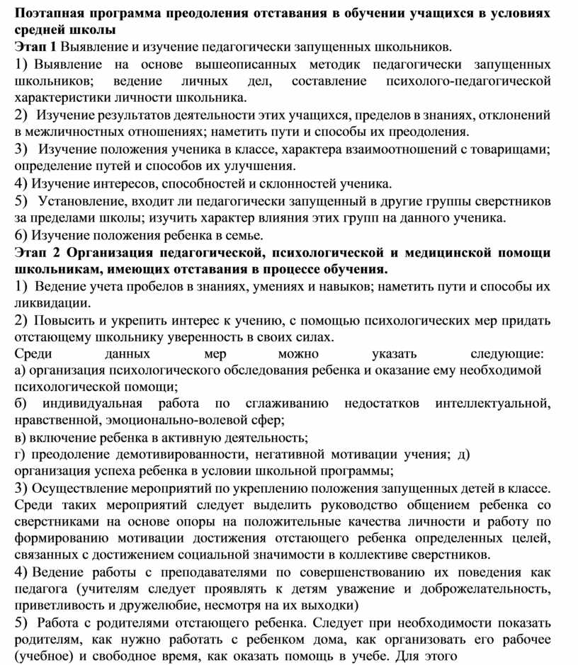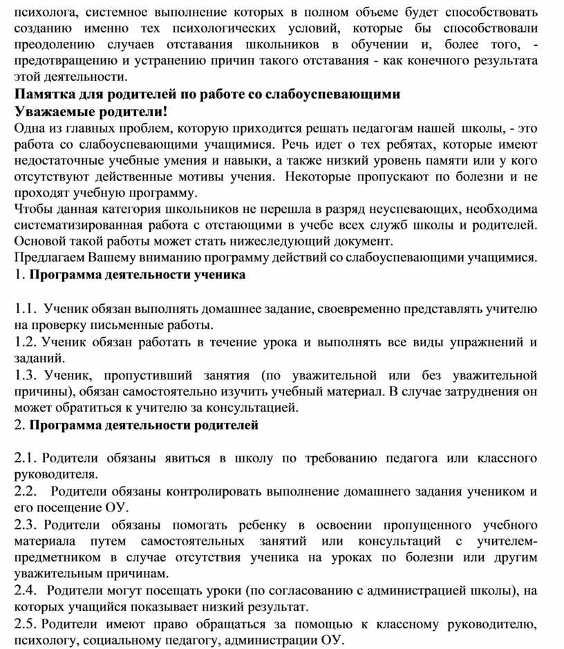 Чтобы данная категория школьников не перешла в разряд неуспевающих, необходима систематизированная работа с отстающими в учебе всех служб школы и родителей. Основой такой работы может стать нижеследующий документ.
