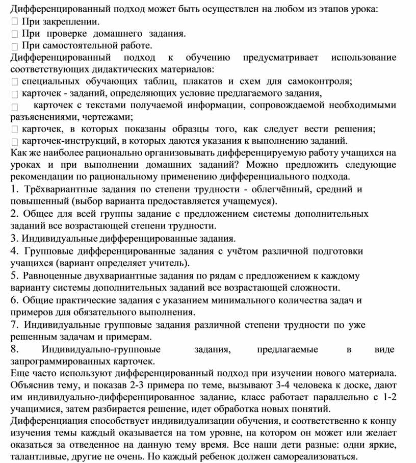 Как же наиболее рационально организовывать дифференцируемую работу учащихся на уроках и при выполнении домашних заданий? Можно предложить следующие рекомендации по рациональному применению дифференциального подхода.