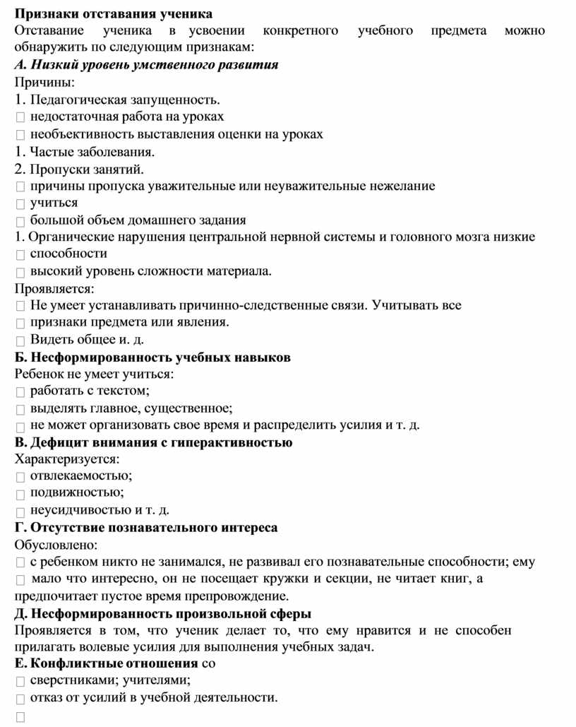 Отставание ученика в усвоении конкретного учебного предмета можно обнаружить по следующим признакам: