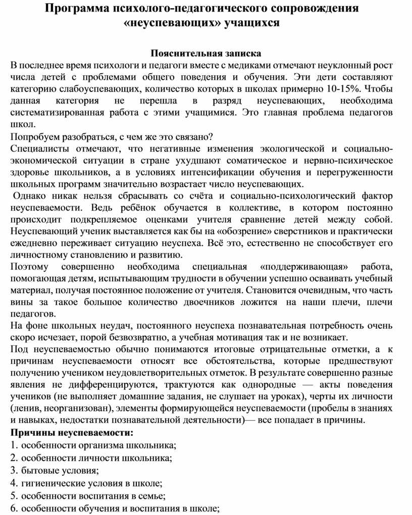 Программа психолого-педагогического сопровождения «неуспевающих» учащихся