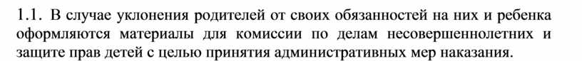 2.6. В случае уклонения родителей от своих обязанностей на них и ребенка оформляются материалы для комиссии по делам несовершеннолетних и защите прав детей с целью принятия административных мер наказания.