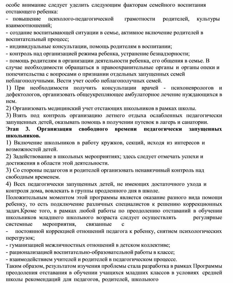 Таким образом, результатом изучения проблемы стала разработка в рамках Программы преодоления отставания в обучении учащихся младших классов в условиях средней школы рекомендаций для педагогов, родителей, школьного