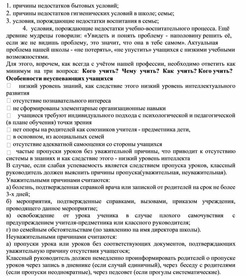 В случае, если слабая успеваемость является следствием пропуска уроков, классный руководитель должен выяснить причины пропуска(уважительная, неуважительная).