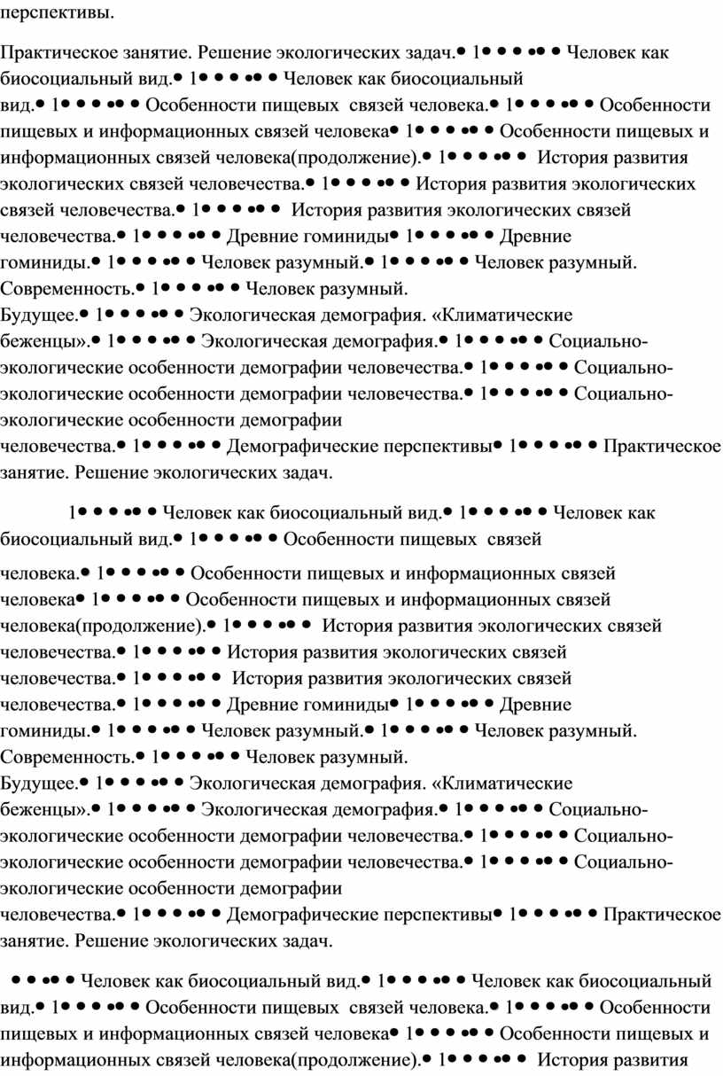 Экологические связи человека. Человек как биосоциальный вид. Особенности пищевых и информационных связей человека. История развития экологических связей человечества. Древние гоминиды. Человек разумный. Современность. Будущее. Экологическая демография. Социально-экологические особенности демографии человечества. Демографические перспективы.