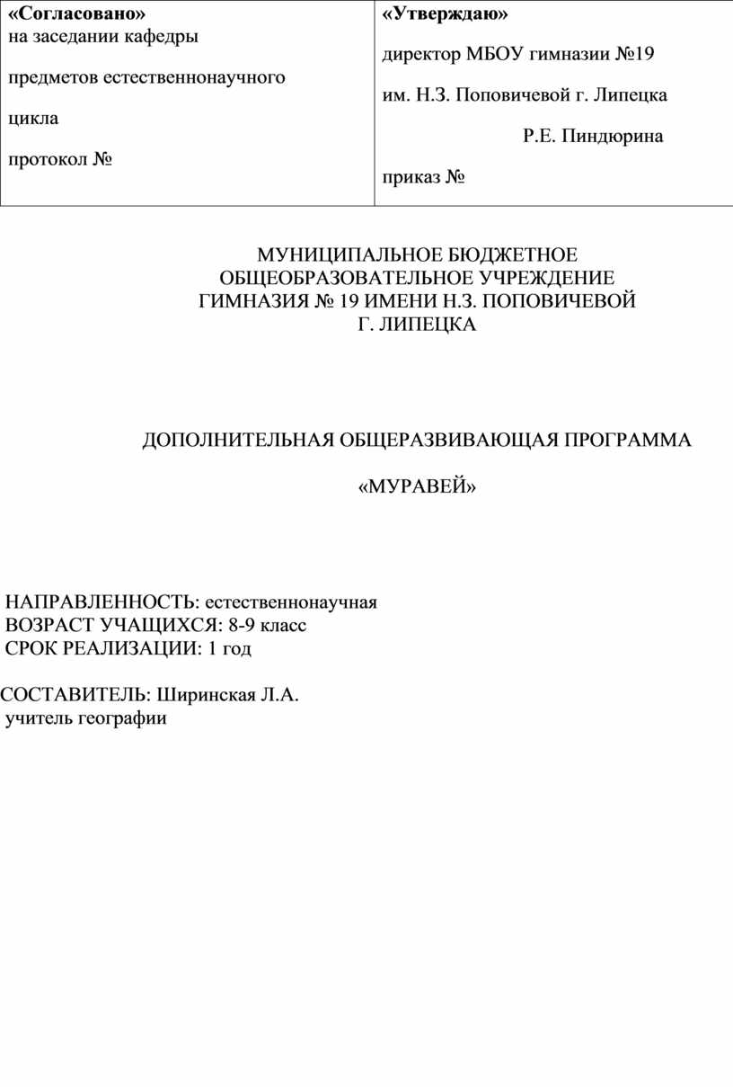 «Утверждаю» директор МБОУ гимназии №19 им. Н.З. Поповичевой г. Липецка Р.Е. Пиндюрина приказ № |