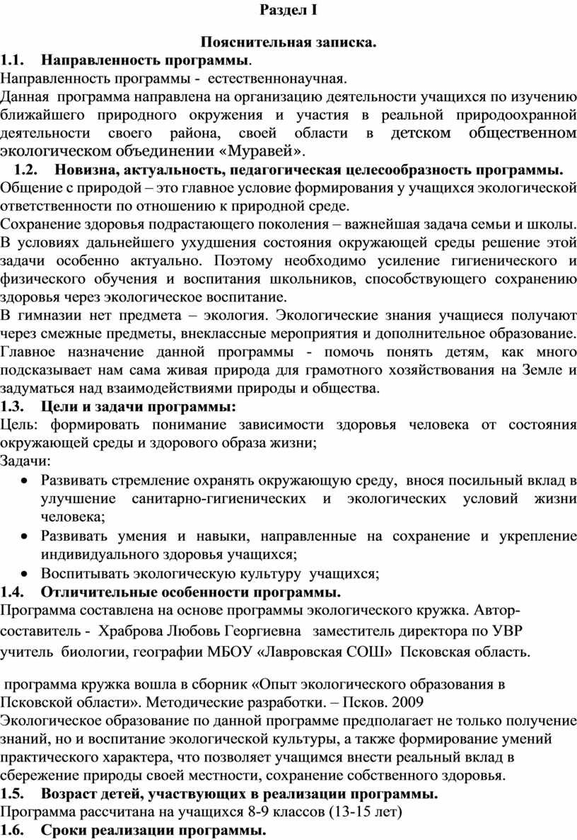Данная программа направлена на организацию деятельности учащихся по изучению ближайшего природного окружения и участия в реальной природоохранной деятельности своего района, своей области в детском общественном экологическом объединении «Муравей».