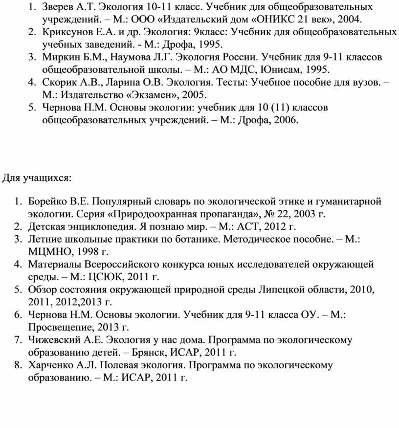 9. Зверев А.Т. Экология 10-11 класс. Учебник для общеобразовательных учреждений. – М.: ООО «Издательский дом «ОНИКС 21 век», 2004.