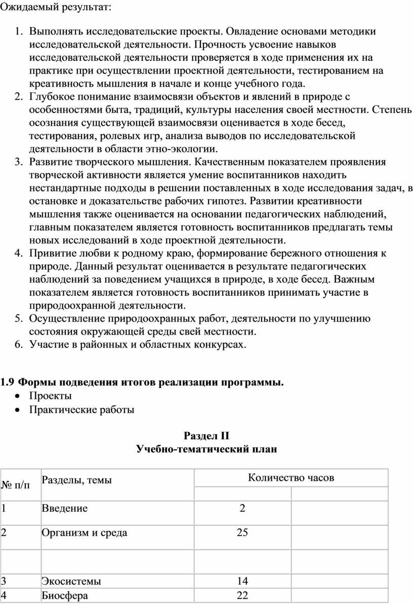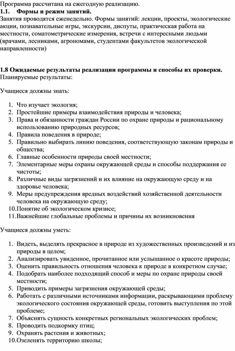 Экологическое образование по данной программе предполагает не только получение знаний, но и воспитание экологической культуры, а также формирование умений практического характера, что позволяет учащимся внести реальный вклад в сбережение природы своей местности, сохранение собственного здоровья.