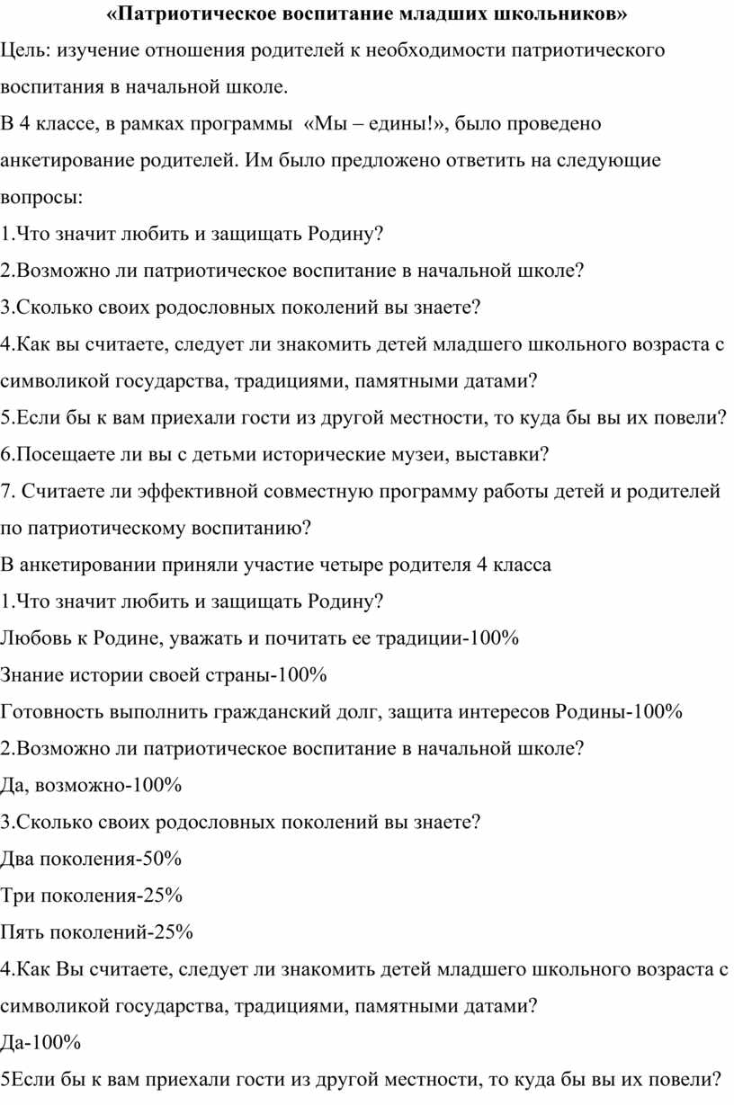В 4 классе, в рамках программы «Мы – едины!», было проведено анкетирование родителей. Им было предложено ответить на следующие вопросы: