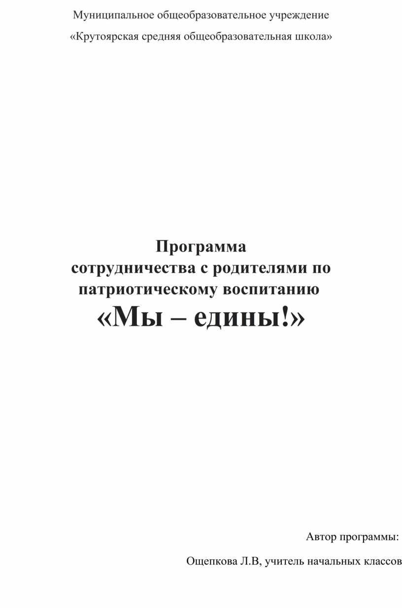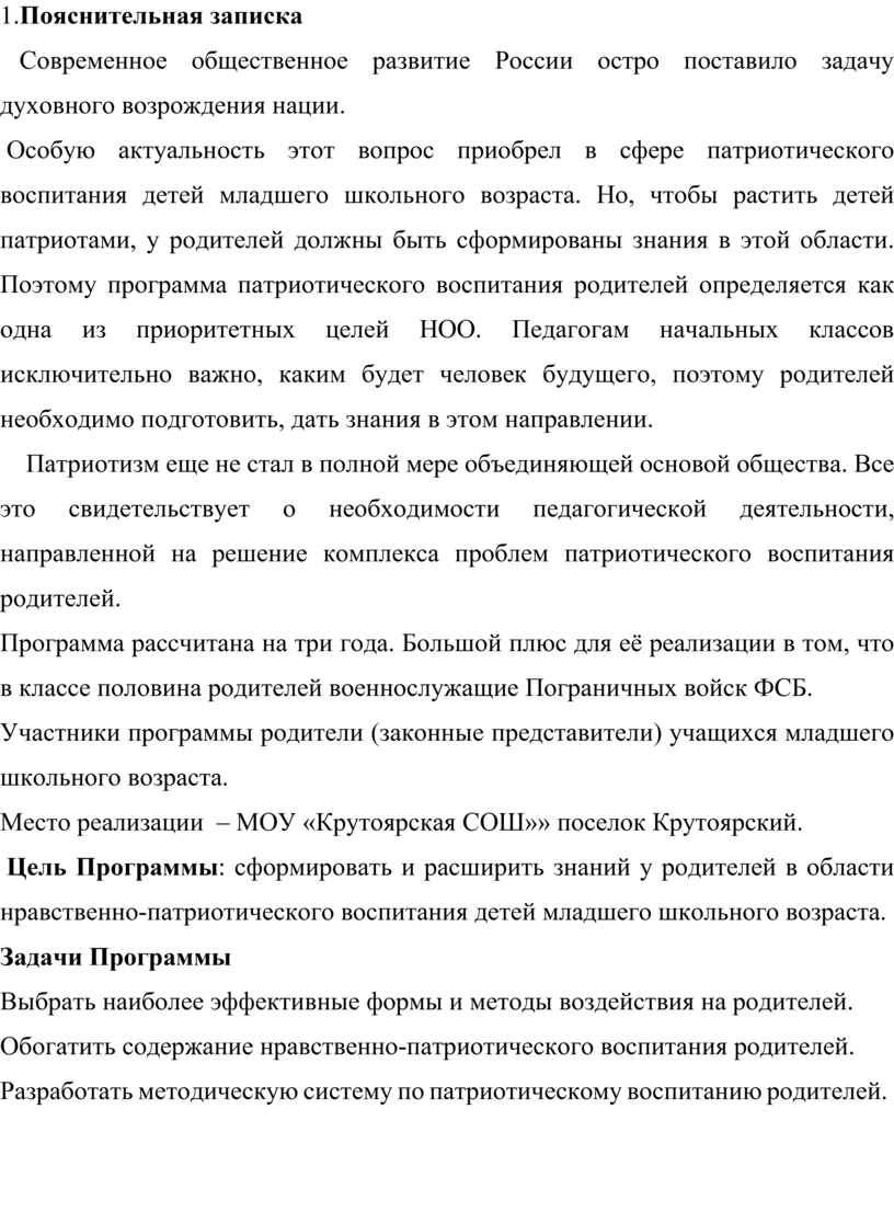 Цель Программы: сформировать и расширить знаний у родителей в области нравственно-патриотического воспитания детей младшего школьного возраста.