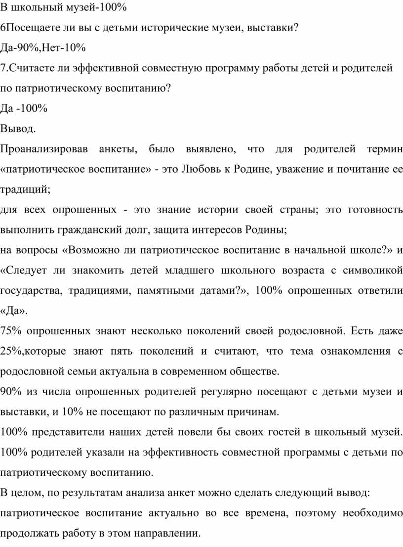 100% представители наших детей повели бы своих гостей в школьный музей. 100% родителей указали на эффективность совместной программы с детьми по патриотическому воспитанию.