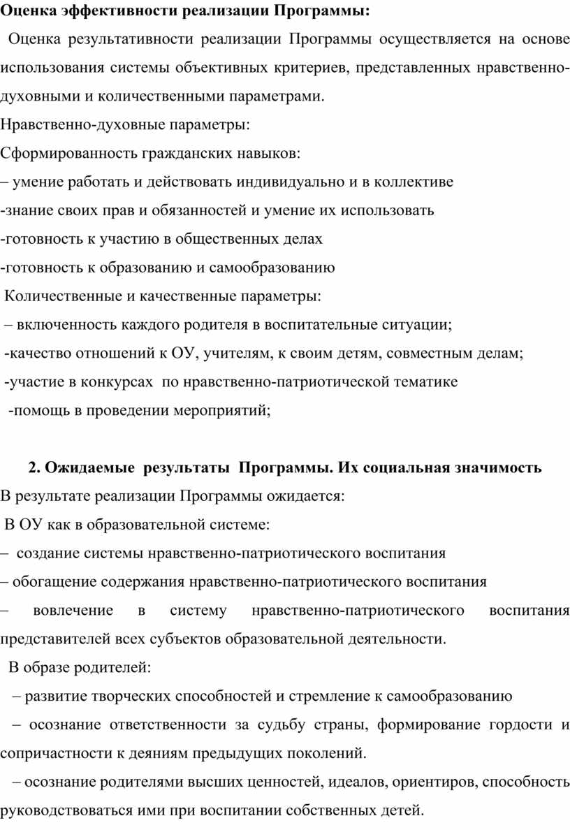 Оценка результативности реализации Программы осуществляется на основе использования системы объективных критериев, представленных нравственно-духовными и количественными параметрами.