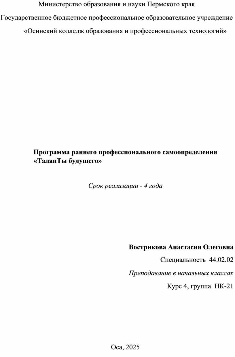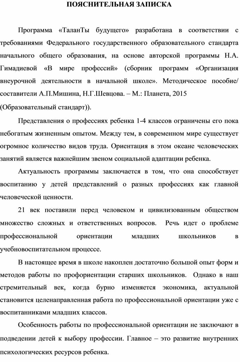 Программа «ТаланТы будущего» разработана в соответствии с требованиями Федерального государственного образовательного стандарта начального общего образования, на основе авторской программы Н.А. Гимадиевой «В мире профессий» (сборник программ «Организация внеурочной деятельности в начальной школе». Методическое пособие/ составители А.П.Мишина, Н.Г.Шевцова. – М.: Планета, 2015
