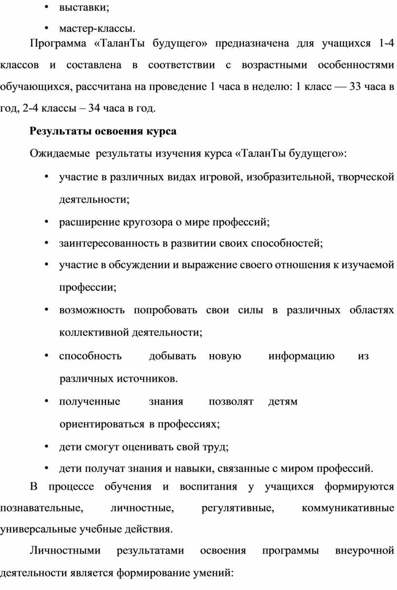 Программа «ТаланТы будущего» предназначена для учащихся 1-4 классов и составлена в соответствии с возрастными особенностями обучающихся, рассчитана на проведение 1 часа в неделю: 1 класс — 33 часа в год, 2-4 классы – 34 часа в год.