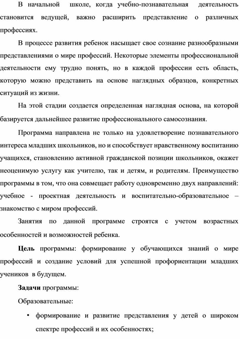 Программа направлена не только на удовлетворение познавательного интереса младших школьников, но и способствует нравственному воспитанию учащихся, становлению активной гражданской позиции школьников, окажет неоценимую услугу как учителю, так и детям, и родителям. Преимущество программы в том, что она совмещает работу одновременно двух направлений: учебное - проектная деятельность и воспитательно-образовательное – знакомство с миром профессий.