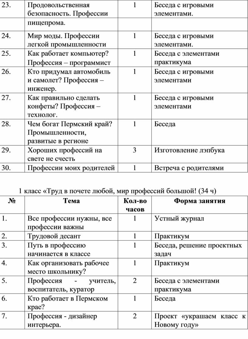4 класс «Труд в почете любой, мир профессий большой!» (формирование добросовестного отношения к труду, понимания его роли в жизни человека и общества, развитие интереса к будущей профессии.) - 34 ч.