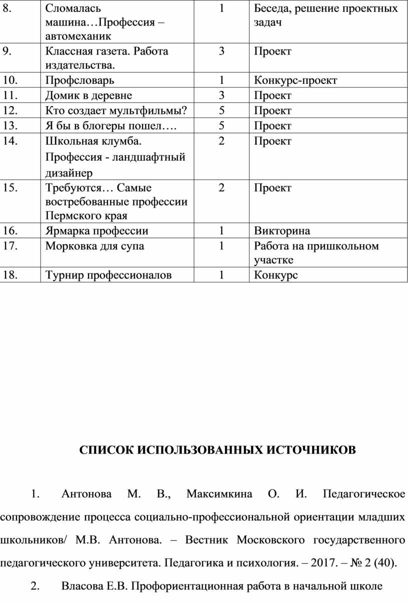 1. Антонова М. В., Максимкина О. И. Педагогическое сопровождение процесса социально-профессиональной ориентации младших школьников/ М.В. Антонова. – Вестник Московского государственного педагогического университета. Педагогика и психология. – 2017. – № 2 (40).