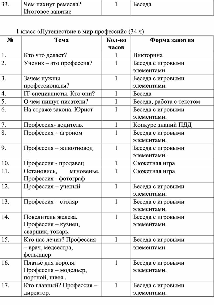 2 класс «Путешествие в мир профессий» (расширение представлений детей о мире профессий) - 34 ч.
