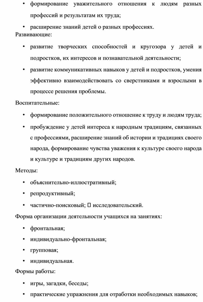 • пробуждение у детей интереса к народным традициям, связанных с профессиями, расширение знаний об истории и традициях своего народа, формирование чувства уважения к культуре своего народа и культуре и традициям других народов.