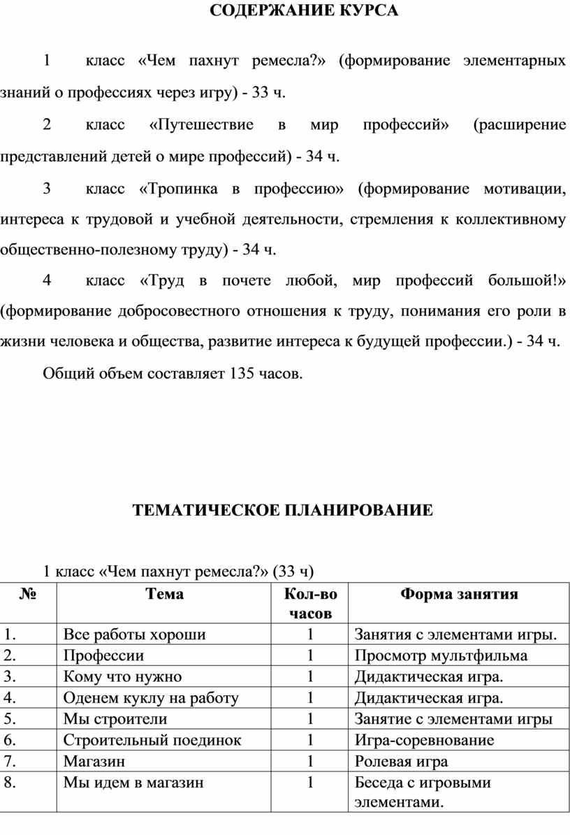 1 класс «Чем пахнут ремесла?» (формирование элементарных знаний о профессиях через игру) - 33 ч.